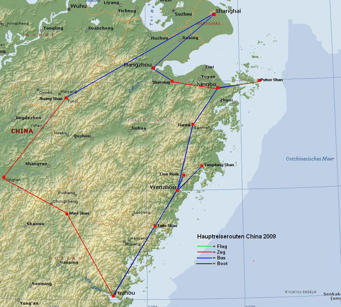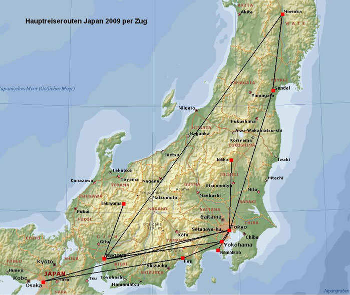 Meine Reiseroute musste ich den Quartiermoeglichkeiten anpassen. In Japan gibt es keine solchen Hotelueberkapazitaeten wie in China. Fuer das