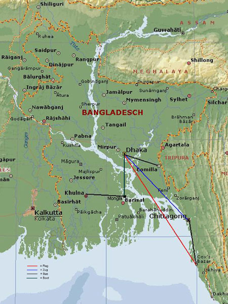 konnten. Wir beschafften uns Info's, besuchten interessante Punkte und regelten dies und jenes, so auch das Zugticket nach Chittagong. Am Abfahrtstag war landesweiter Generalstreik. Unser Zug fuhr gluecklicherweise trotzdem.
