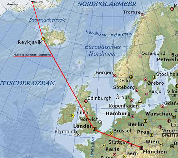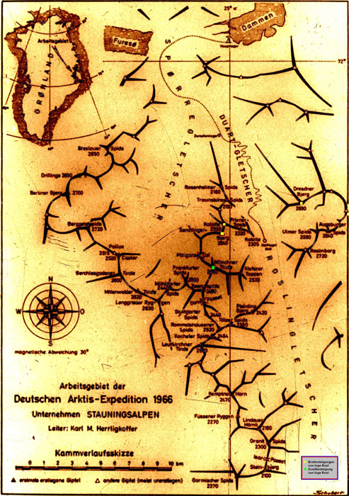 Eigentlich wollten wir zum Nordpol, aber das scheiterte an diversen Genehmigungsformalitaeten. Unser Expeditionsleiter Dr. Karl Herrligkoffer waehlte deshalb die Stauningsalpen in Groenland als Alternative. Die Anreise erfolgte per Flug von Muenchen ueber Island nach Mestersvik in Groenland. Von da ging es per Fischerkahn durch einen langen Fjord und spaeter ueber ansteigendes Eis zu einem ebenem Gletscher mitten zwischen den von uns ausgesuchten Bergen.