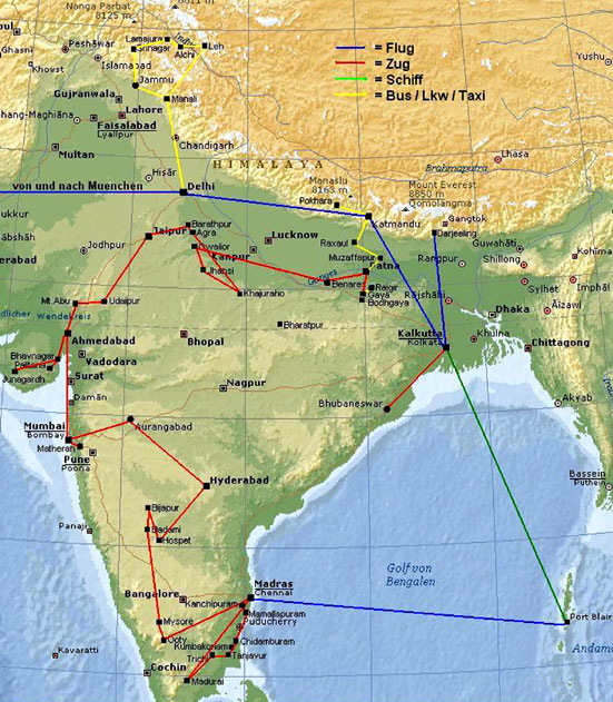 Es ist Abfahrtszeit. Wir sitzen im Abteil. Da sieht Inge, dass einigen Leuten im Nachbarabteil Bettwaesche gebracht wird. Sie sagt: „Siehst Du, haettest vielleicht etwas energischer sein muessen". Ich renne zum Bahnhofsgebaeude zurueck und verlange das Beschwerdebuch. Man schickt mich zum Chef. Der fragt nach dem Grund meiner Beschwerde. Er meint, dass die Bettwaesche im ersten Stock liege und die Angestellten nur zu faul waeren sie herunter zu holen. Er will es gleich selbst erledigen. Ich zeige auf den bereits anfahrenden Zug. „Bedrolls will come", ruft er mir nach. (Die Zuege rollen in Indien allgemein sehr langsam aus den Bahnhoefen, und auch danach dauert es noch einige Zeit bis sie recht in Fahrt kommen.) Ich springe auf den aus dem Bahnhof rollenden Zug. Durch's Fenster sehe ich wie ein Mann, mit Bettwaesche unter den Armen, dem noch immer im Schrittempo rollenden Zug nachrennt. Ich reise die Tuer auf und winke. Der Mann schafft es. Ich zahle die Gebuehr und ein Trinkgeld. Der Mann bedankt sich und springt ab.