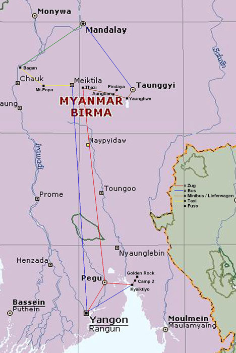 wenn sich jemand nicht einschuechtern laesst.) Wir sind dann per Zug, mit Zwischenaufenthalt in Bago, nach Rangun zurueck. Die Leute liessen uns immer wieder verstehen, dass sie ihre Regierung und die Armee nicht moegen. (