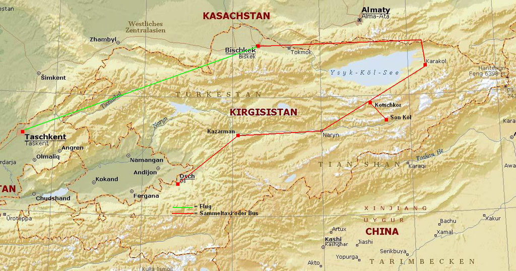 Sie hat viel telefoniert. Ich weiß nicht mit wem, aber sicher mit den falschen Leuten. Sie kannte die Leute nicht. Später, als alles schon vorbei war, sah ich dass sie die Nummern einem kostenlosen Stadtplan, wie sie auf den Ankunftsflughäfen ausliegen, entnahm. Da sind Werbeadressen drauf, von Leuten die Geschäfte machen wollen, evtl. auch unsaubere Geschäfte. Diese Leute haben sie ordentlich über den Tisch gezogen. Wenn die merken da ist ein Ahnungsloser, ist es wahrscheinlich egal wer das ist. Davon bleibt auch ein Kirgise nicht verschont. Aufgrund der guten Erfahrungen bei Marzy habe ich gar nichts geprüft, obwohl ich es in gedruckter Form besaß. Wahrscheinlich hatte sie mit einem Taxiunternehmen telefoniert, und die hatten so beraten wie für sie das beste Geschäft heraussprang. Sie hatten gesagt es fahren keine Marschrutkas zum Nationalpark. Im Reisführer konnte ich lesen, dass diese am Osch-Bazar abfahren. Leider habe ich das erst gelesen als alles bereits daneben gegangen war.