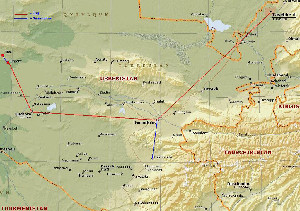 Ich bin zur Nationalbank, die schwer auffindbar war weil niemand wusste wo die ist. Hatte umgeplant. Wollte zunächst per Bahn nach Samarkand und von dort später per Schlafwagen nach Urgent, das nur 30 km von Xiva entfernt ist. Mir wurde erzählt, dass es Bahntickets nur am 16 km entfernten Bahnhof zu kaufen gäbe. Auf dem Rückweg von der Bank kam ich am Büro einer privaten Busgesellschaft vorbei, die ausnahmsweise ein Werbeplakat mit einem Bus an der Tür hatten. Ich fragte ob die auch Bahntickets hätten. Die Tante sagte, 20 m weiter sei ein Fenster ohne Kennzeichen, dort wäre ein Büro der staatlichen Bahngesellschaft. Habe da gleich alle Bahntickets für meinen gesamten Usbekistanaufenthalt gekauft. Habe viele Wege gespart, und mit dem Nachtschnellzug 1ter Klasse bin ich angenehm und nicht teurer gefahren als per Sammeltaxi, aber niemand kannte diese Möglichkeit. Habe die Kosten für 2 Hotelnächte gespart und auch Zeit gewonnen. Ein guter Meister bleibt ewig Lehrling. Ich fühle mich sehr wohl in dieser Rolle.