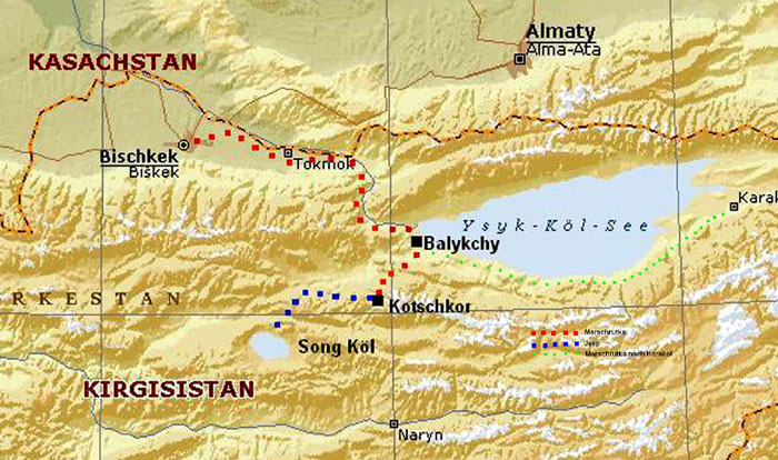 Zunächst bin ich von Kotschkor per Marschrutka nach Karakol in mein sehr schönes Quartier bei Marzey. Zwei Besuche im guten Restaurant gleich nebenan, Gaseinkauf und sonstige Erledigungen. Danach war ich fertig zum Aufbruch. Ich hatte diesmal das Glück die Marzey und Jörg ihren Ehemann, einen Manager der Firma Nestle, samt Tochter persönlich kennen zu lernen. Alles sehr nette Leute.