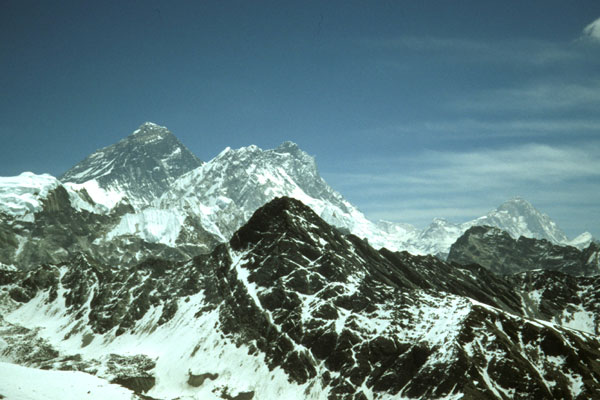 Blick vom Gokyo Peak zu Everest und Nuptse, rechts der Makalu