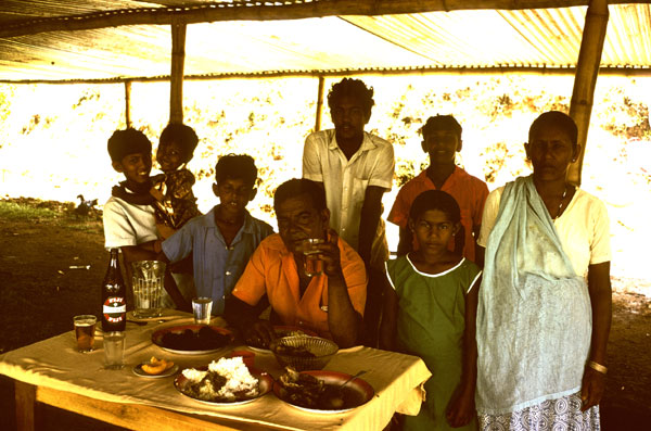 Mahlzeit bei Inderfamilie, der Chef isst mit Gast, Familie schaut zu