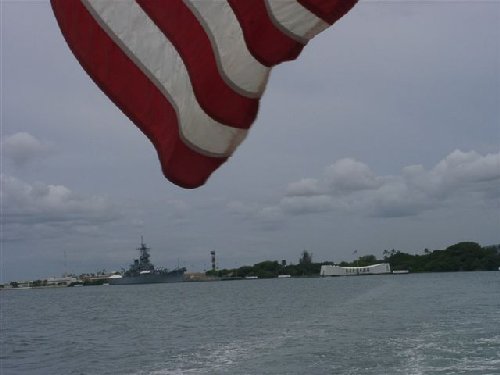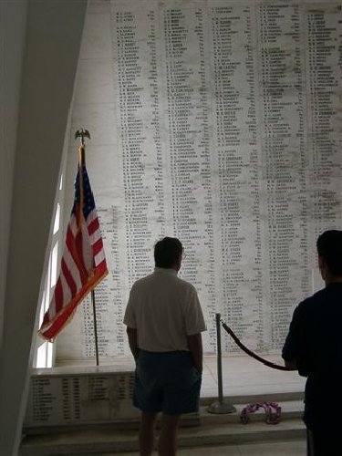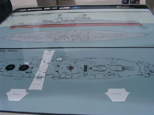 Plan des Mahnmals, es wurde quer über die beim Überfall auf Pearl Harbor am 07.12.41 mit 1177 Matrosen an Bord versenkte USS ARIZONA gebaut. Die Arizona wurde gegen 08:10 getroffen und sank innerhalb von 9 Minuten. Den Matrosen blieb keine Chance sich zu retten. (Es herrschte zu dieser Zeit Frieden zwischen den USA und Japan!)
