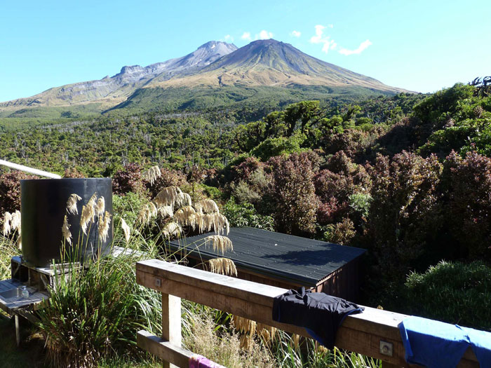 Morgendlicher Blick von der Lake Dive Hütte zum Taranaki