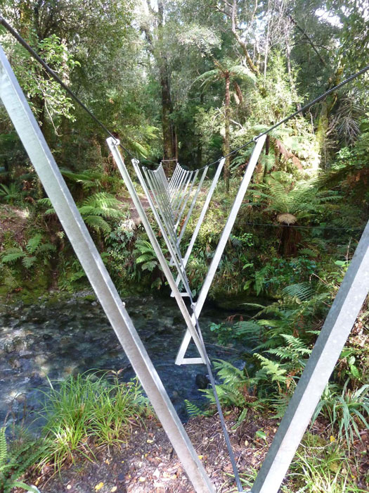 Hängebrücke am Hollyford Trail, kostengünstiger Aufbau