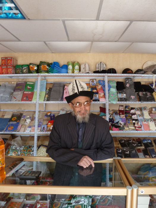 Verkaufsstand im Bazar. Die Mütze verrät den Besitzer als Kirgisen